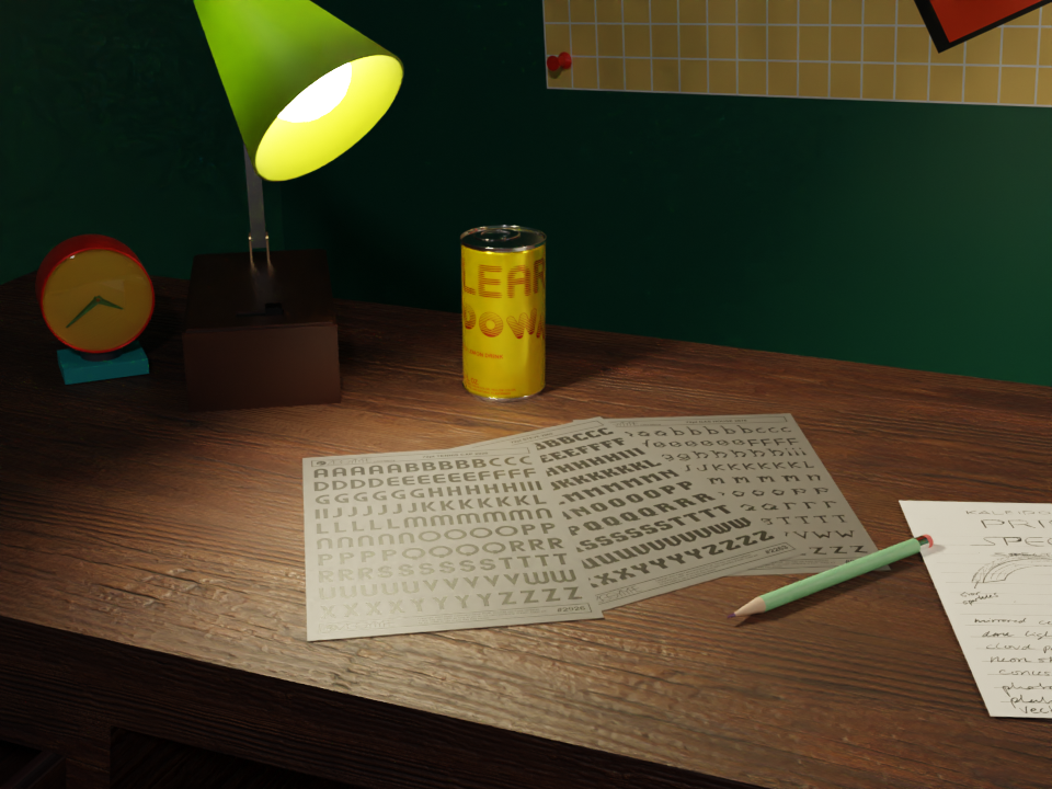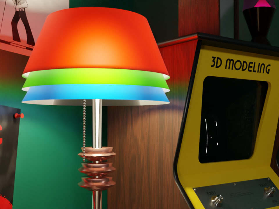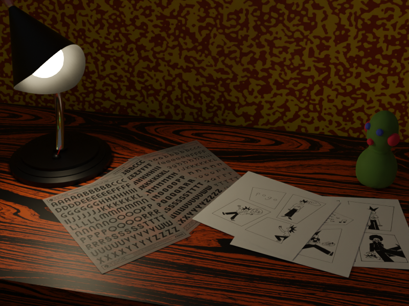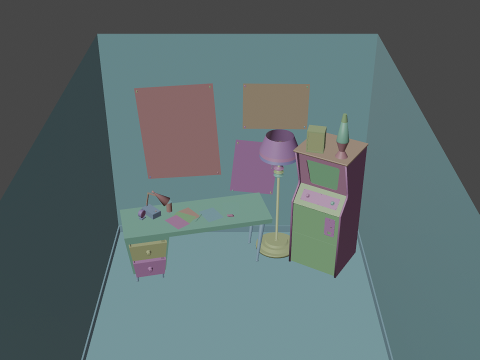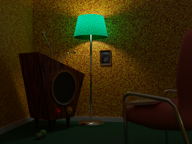 Here's a little "behind the scenes" render of the room, un-textured with random colors.